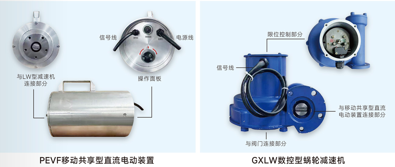 開關過程自動化控制型:有移動共享型直流電動裝置PEVF型和GXLW數控型蝸輪減速機組成,GXLW數控型蝸輪減速是 有普通LW型蝸輪減速第二級或第三級加裝行程計數器控制組成。